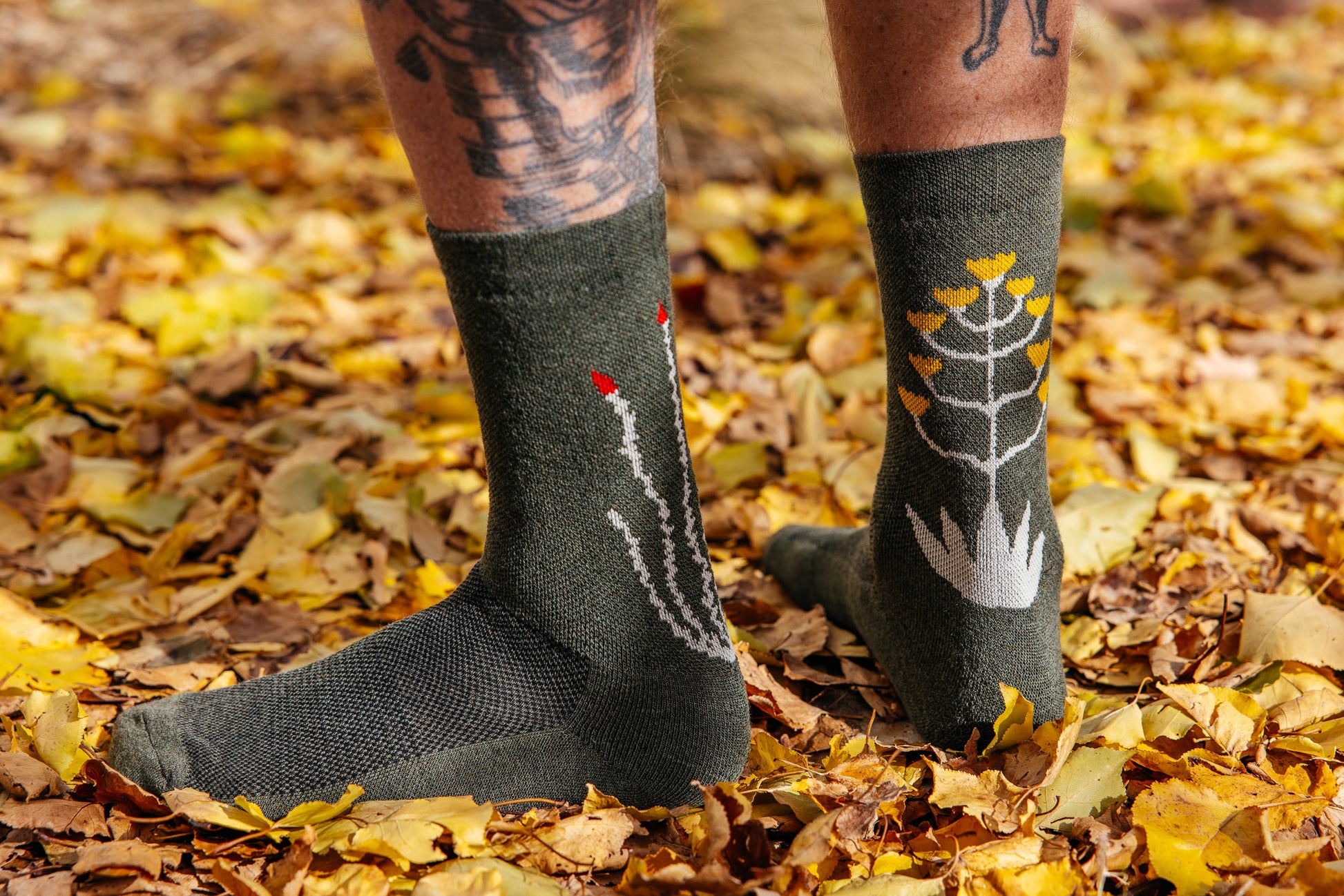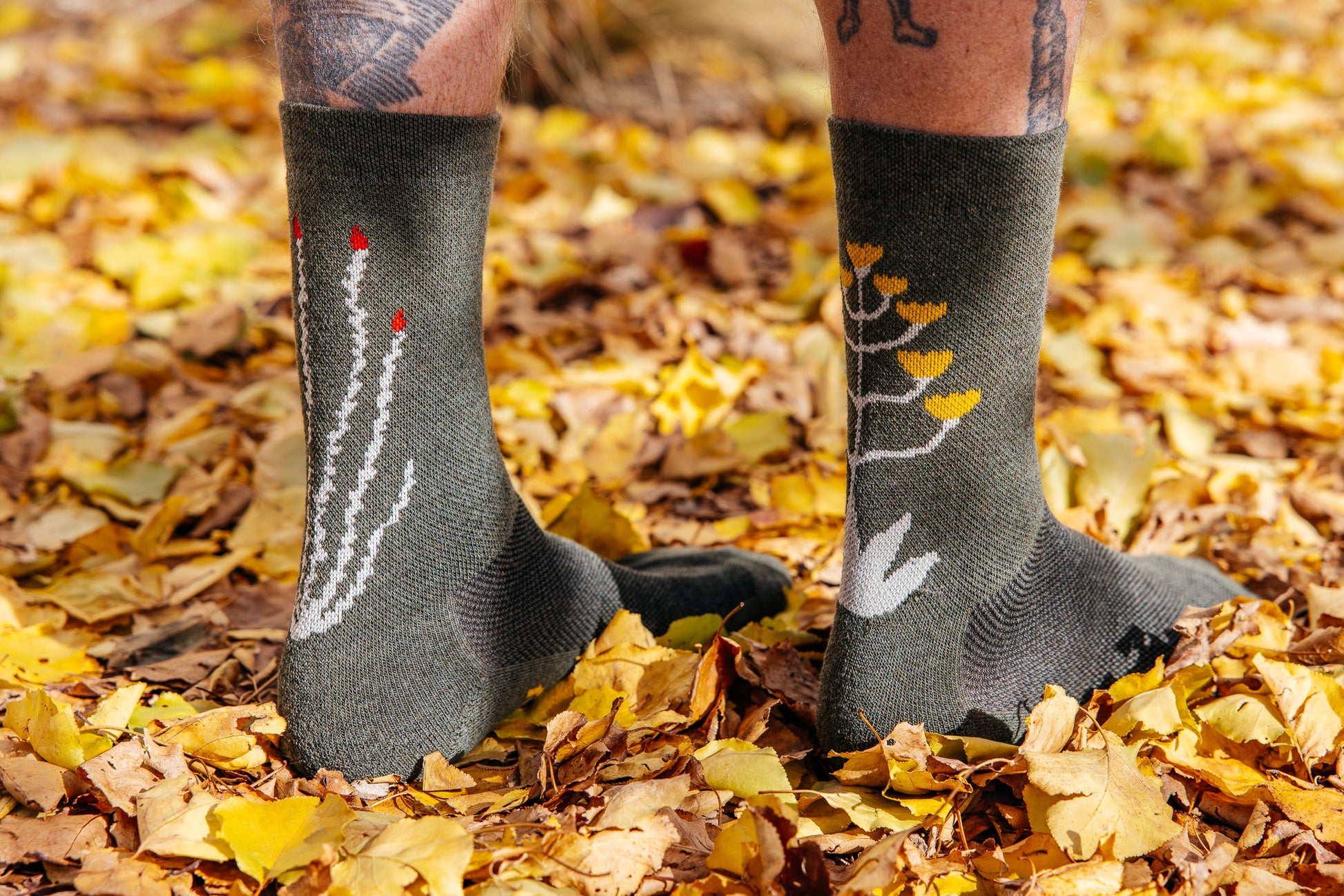 • Juniper Heather wool with an agave illustration on one sock, and an ocotillo on the other