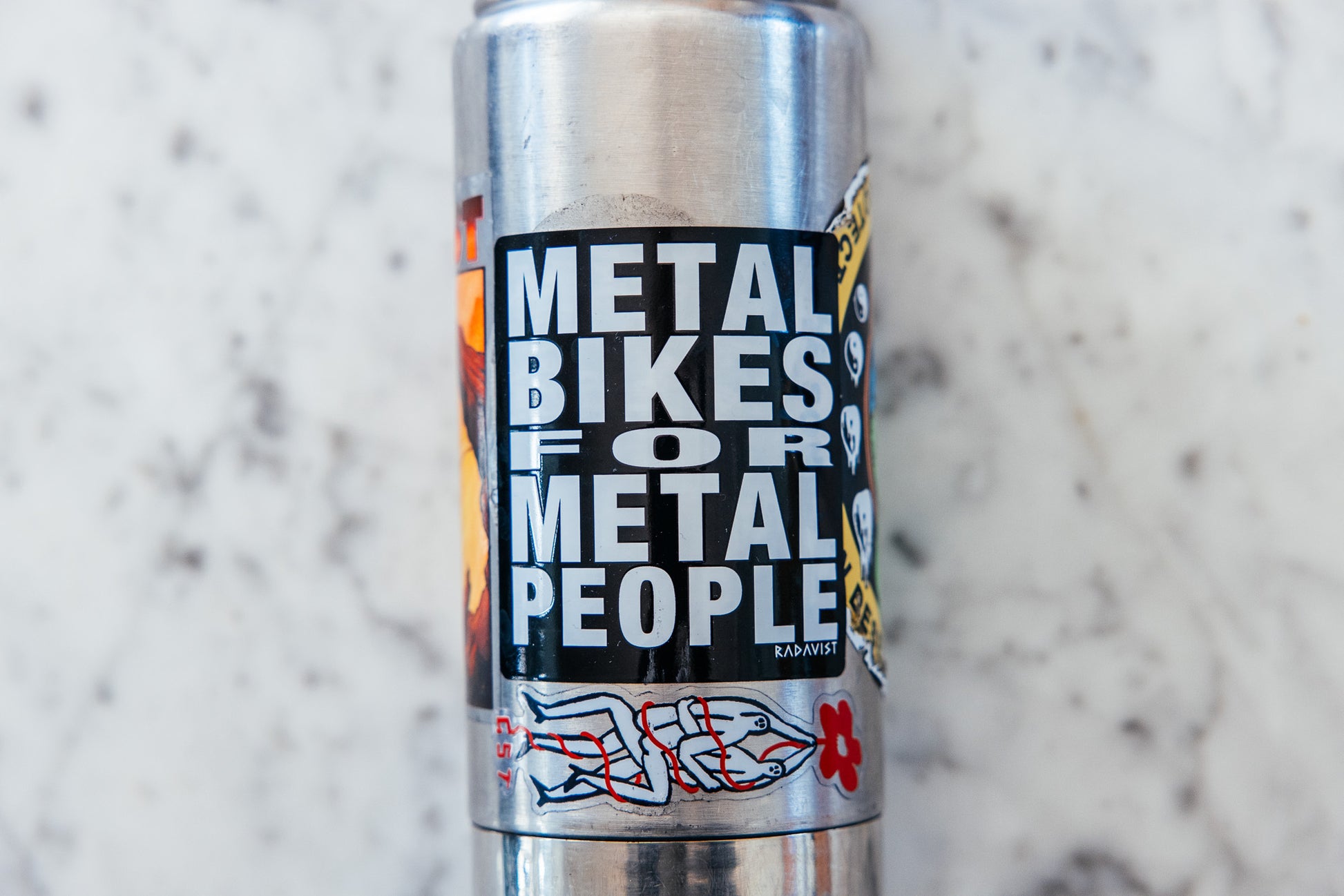Our "Metal Bikes for Metal People" logo sticker is a flip on the "Extreme Music for Extreme People" Morbid Angel shirt that John has in his shirt collection. These embossed stickers are super thick and have a slightly raised feel to the letters.